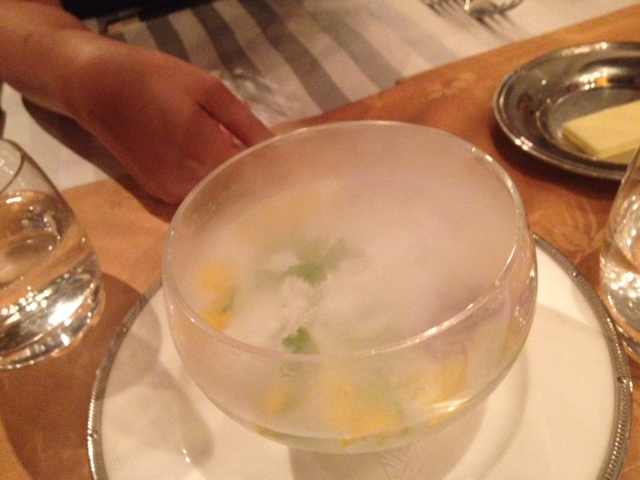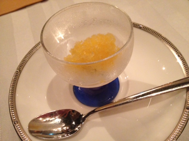 お口直しのシャーベット。みかんだった気がします。冷たくて美味しかったです。