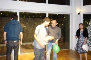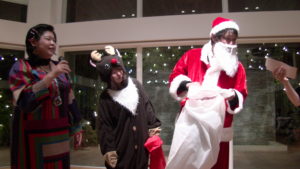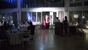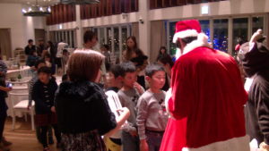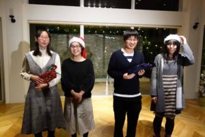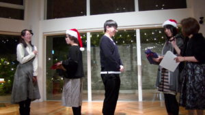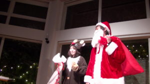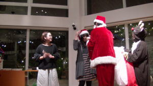 呼ばれて前へ出てくるとそのままサンタ帽をかぶせられ、私たちにバトンタッチ!