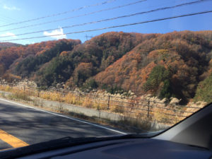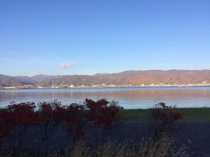 ホテルへ戻る道のりは、今度は諏訪湖をぐるりと半周するルートで。こちらも見事な紅葉でした。