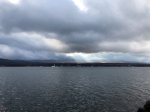 逆さ富士で有名な対岸の親水公園まで、湖を半周。あとちょっとで晴れるかも…というところでしたが、そう都合よくはいかず、残念ながら逆さ富士は拝めませんでした。