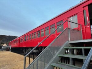 赤い列車が目立ちます。